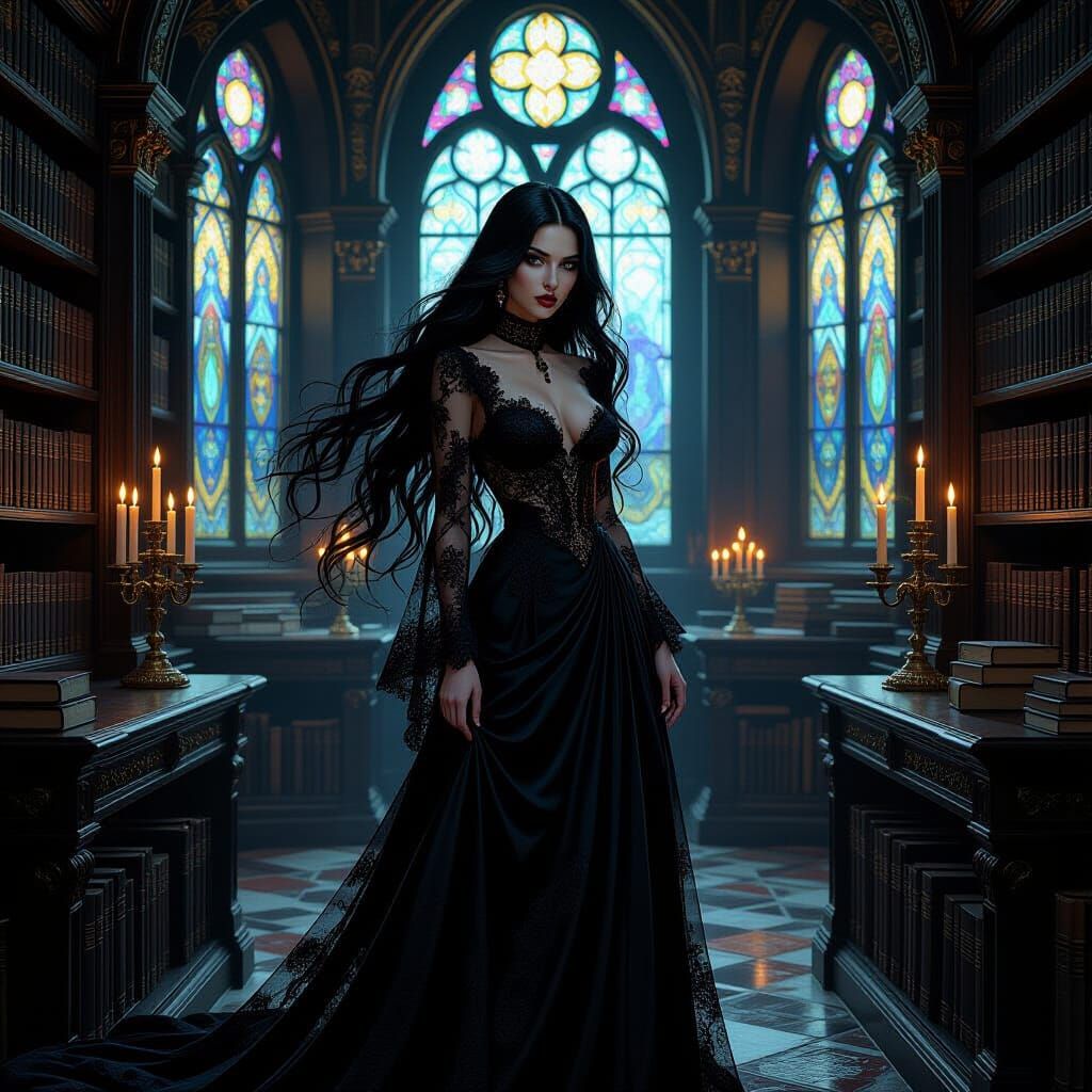 A gothic woman with raven hair in a lace gown stands in a candlelit library. The image evokes art nouveau with surreal and dark fantasy elements.