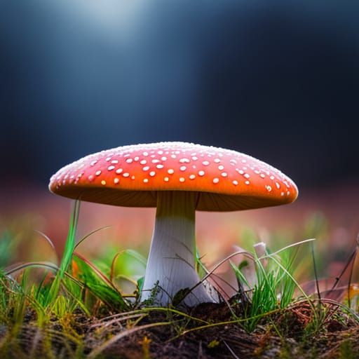 This image shows a vibrant red and green mushroom on forest floor. The composition features heavy shading, rounded forms, and a mushroomcore aesthetic in dark and light tones.