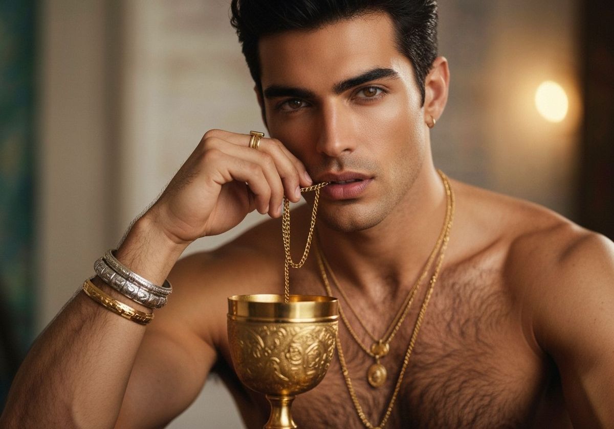 This cinematic portrait features a handsome man with expressive eyes, holding a gold chain to his lips. The image has a mysterious atmosphere with warm, muted colors and soft lighting, reminiscent of high-fashion photography.