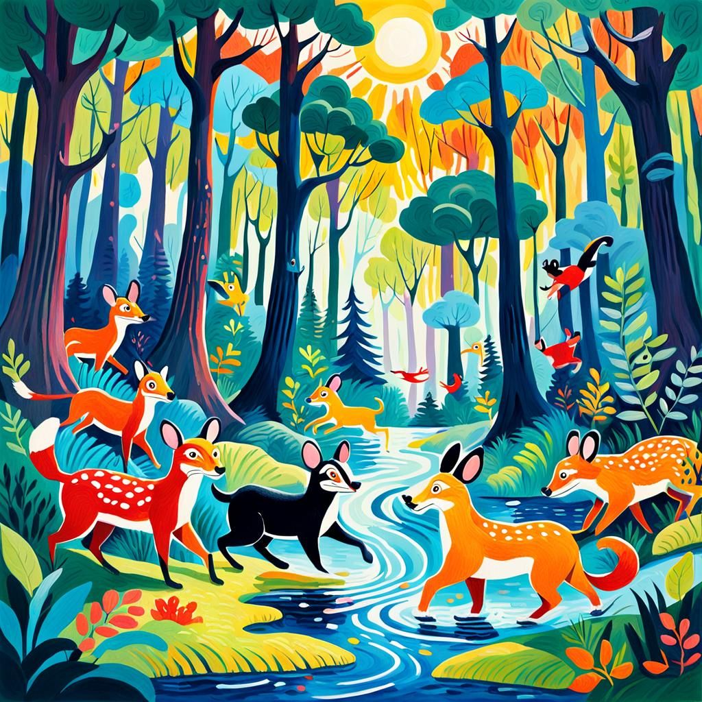 This image is a maximalist masterpiece, reminiscent of Henri Rousseau's style, featuring a colorful forest scene with animals playing together in a vibrant, Impasto textured illustration with bold brush strokes and visible layering.