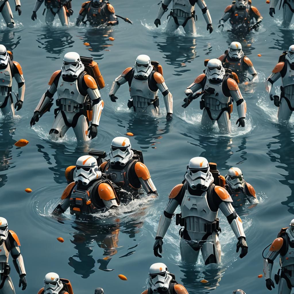 This image shows stormtroopers with scuba gear navigating Kamino's waters. They wear aquatic jetpacks amidst bioluminescent plants, with warm lighting rippling across their armor in this stunning digital artwork.
