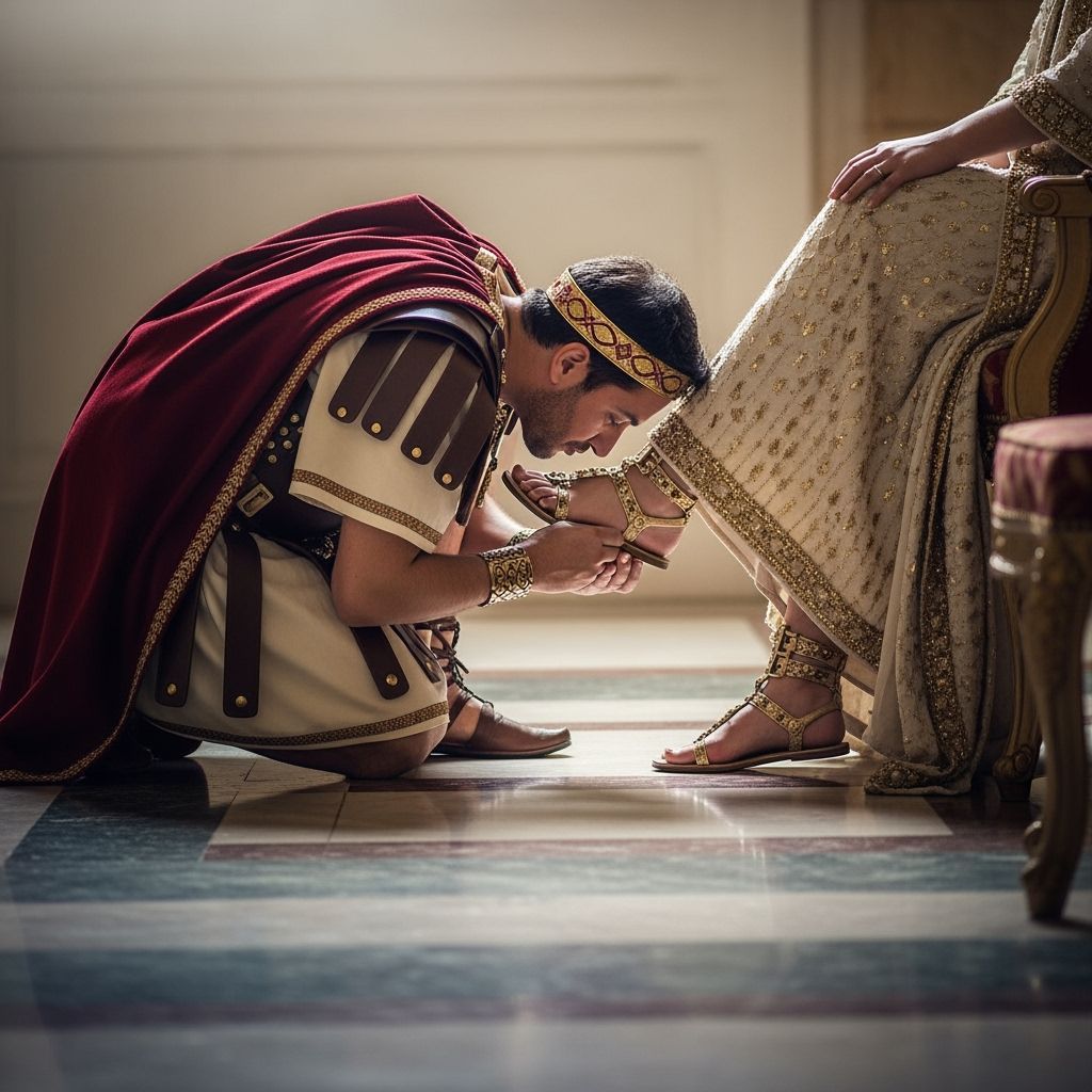 This image shows a Roman servant kneeling before his Empress, kissing her feet. The photograph, reminiscent of classical portraiture, features soft, natural light and a shallow depth of field.
