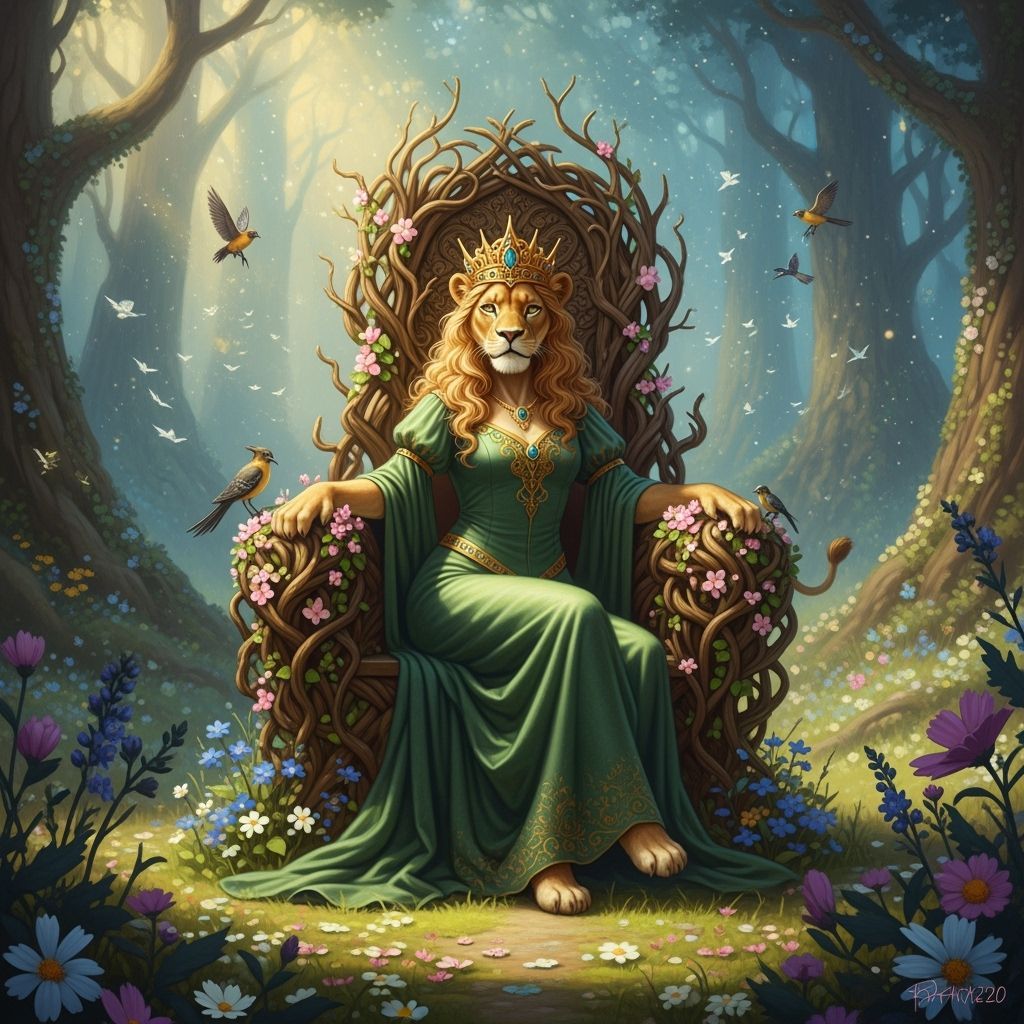 A majestic lioness wearing a crown and gown sits on a floral throne. The scene is set in a sunlit forest clearing with wildflowers and birdsong, rendered with vibrant colors and intricate details inspired by classic fantasy art.