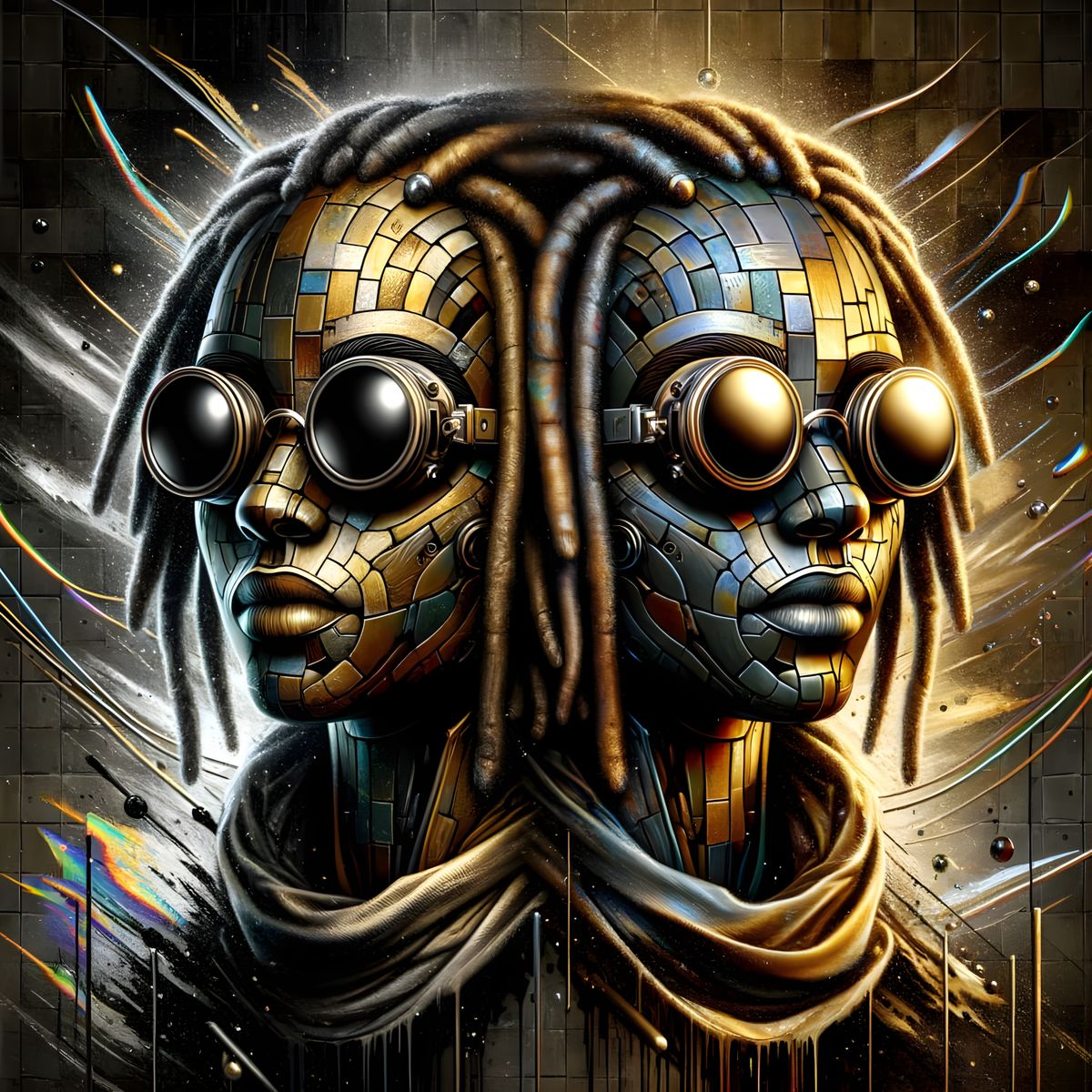 A striking picture of twin figures with large eyes and dreadlocks, rendered with intricate detail and a cracked paint texture. The background is abstract, with black, white, gold, and rainbow colors in a cubist style.