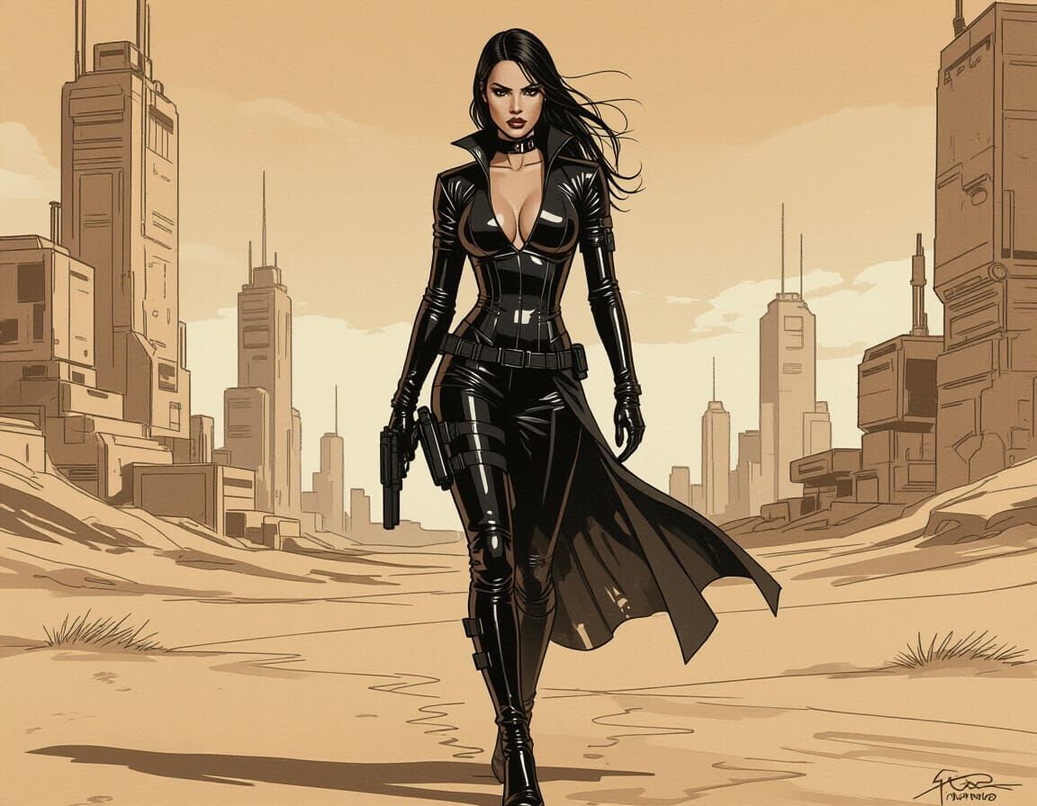 A lone, elegant female bounty hunter in a stylish latex outfit walks through a vast desert near a scavenged-tech city. Rendered in monochrome with brown ink washes and fine linework.