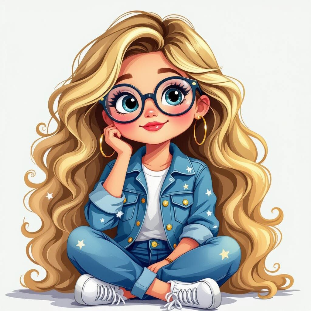 This digital illustration features a stylish cartoon girl with blonde curls, oversized glasses, and a star-patterned denim outfit in a thoughtful pose. Rendered in a vibrant children's design style with soft lighting.