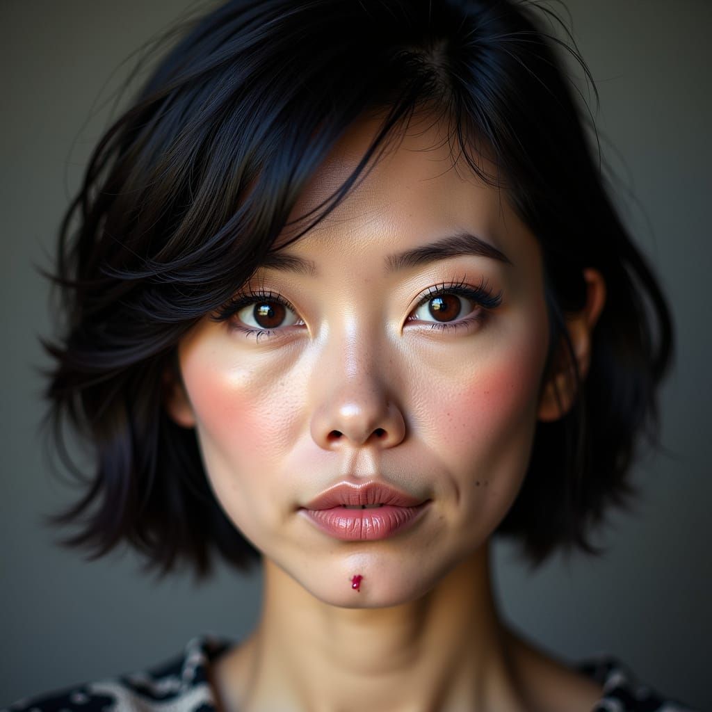 This image showcases a soft-focus portrait of a strong, individualistic woman of mixed heritage, highlighting her femininity and natural beauty with subtle signs of aging and a rose tattoo.