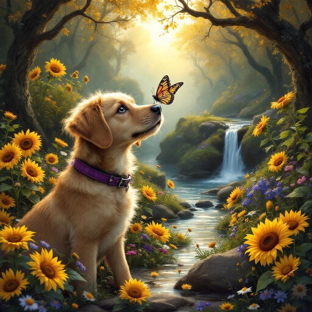 This image shows a light brown dog with a purple collar gazing at a monarch butterfly on its nose. The dog sits among vibrant sunflowers in a whimsical fairy woods, enhanced with soft, golden lighting in an illustrative style.