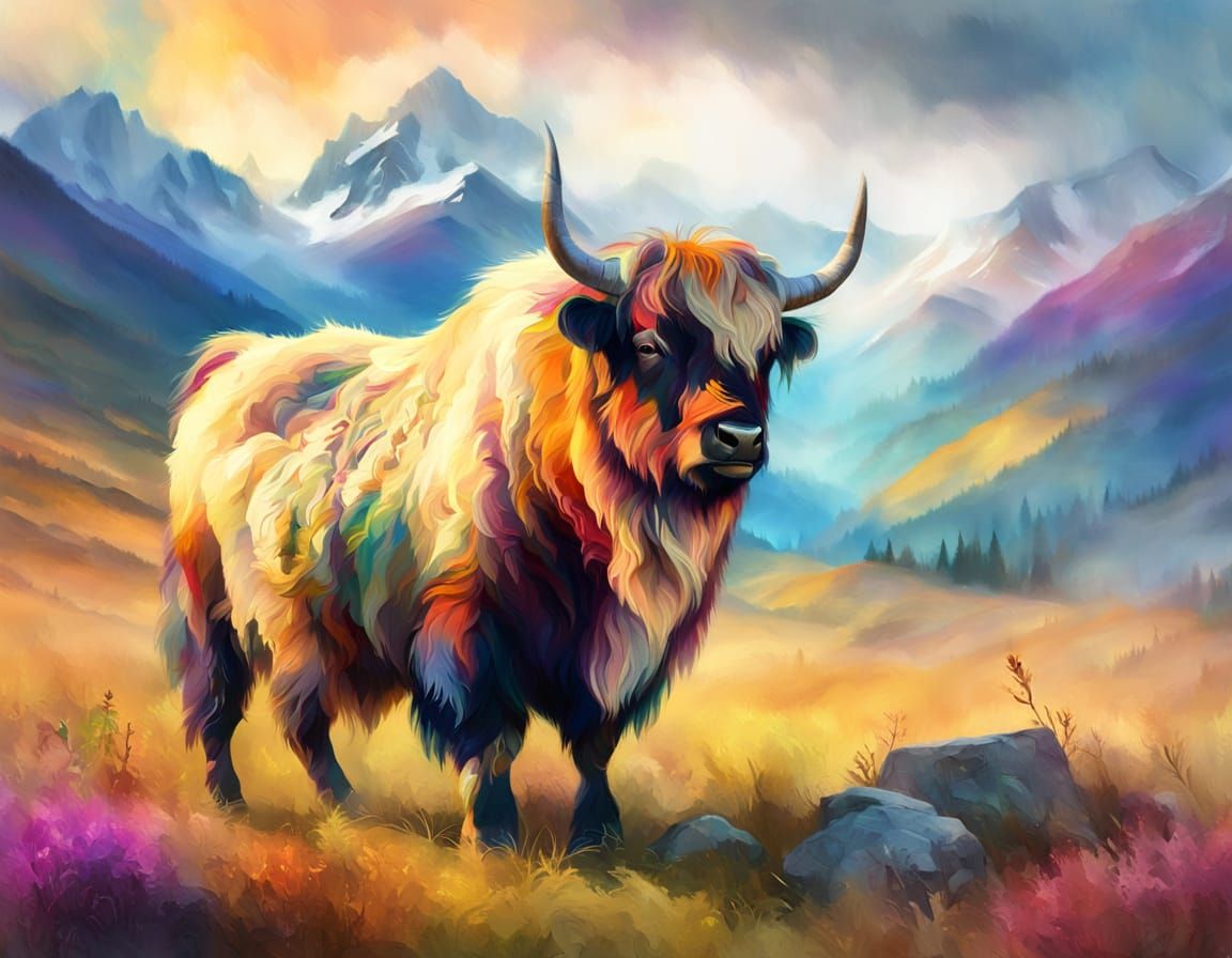 This image shows a young yak in a mountain meadow, depicted as vibrant digital art. The close-up shot emphasizes its fluffy fur and the soft lighting on its horns, set against a misty mountain backdrop.