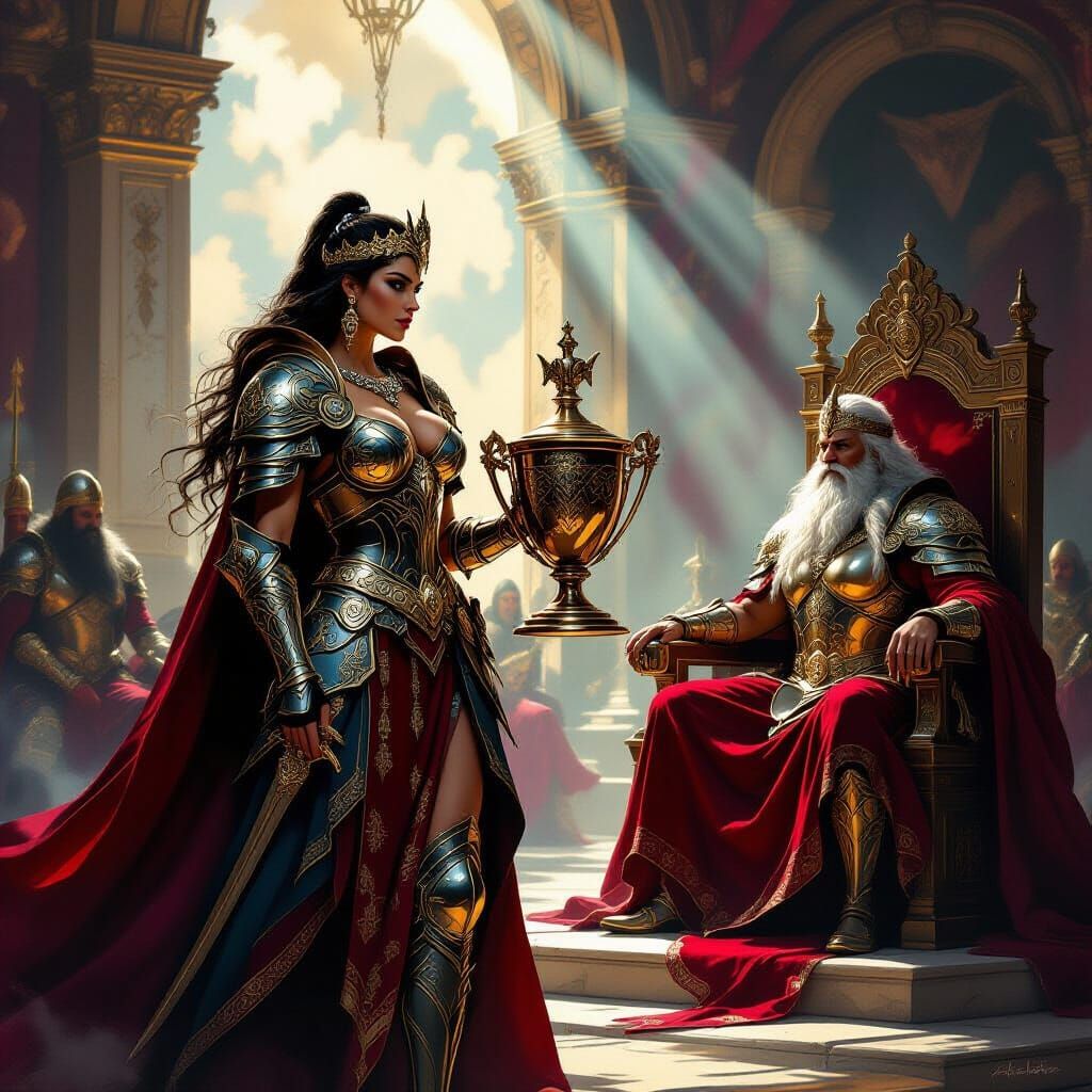 A fierce warrior princess in ornate armor presents a prize to her king and queen. This epic fantasy art features dramatic lighting and rich colors.