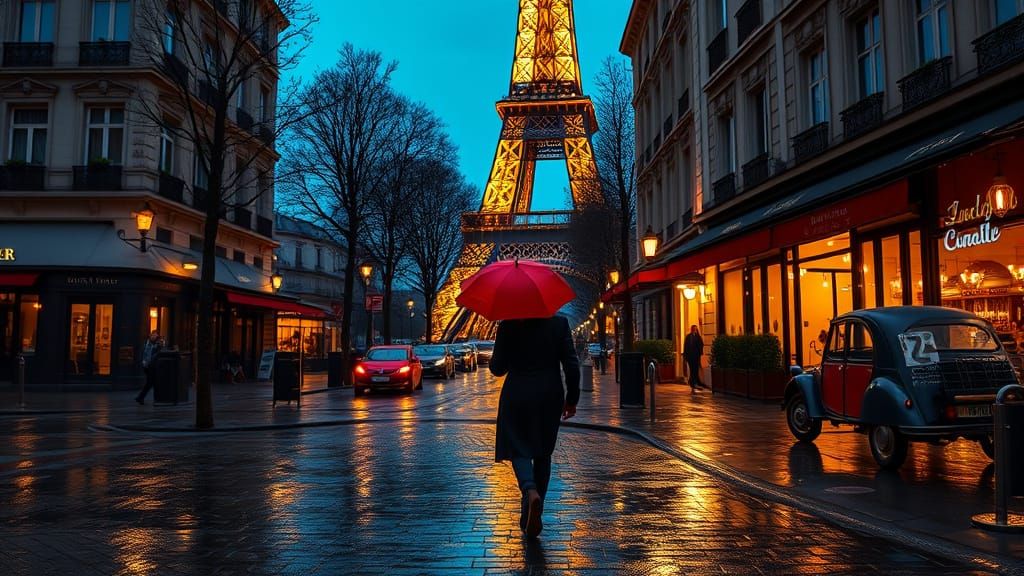 This image shows a couple walking on a wet Parisian street at twilight. The Eiffel Tower dominates the background, its lights reflected on the cobblestones, alongside a bistro and vintage car, in photorealistic detail with bokeh.