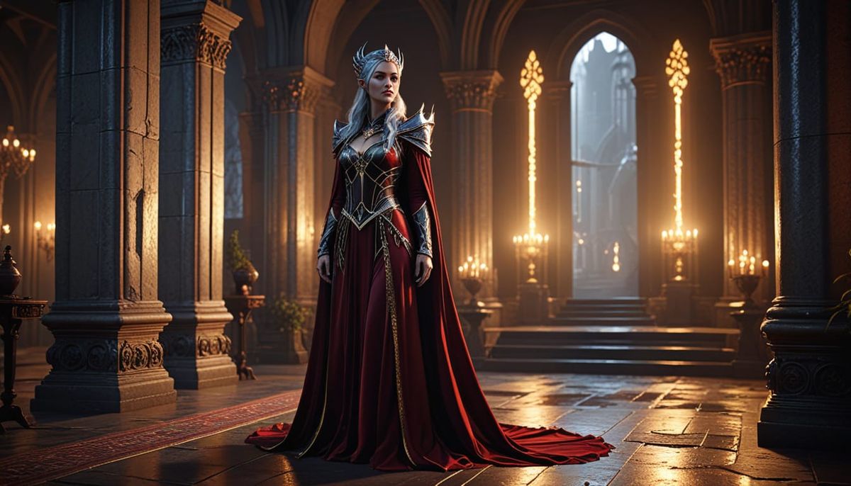 This dark fantasy concept art depicts a regal Elven queen in an Elven castle, adorned with a glowing ruby and sapphire tiara and a rich robe. The image features deep color illumination and dynamic lighting.