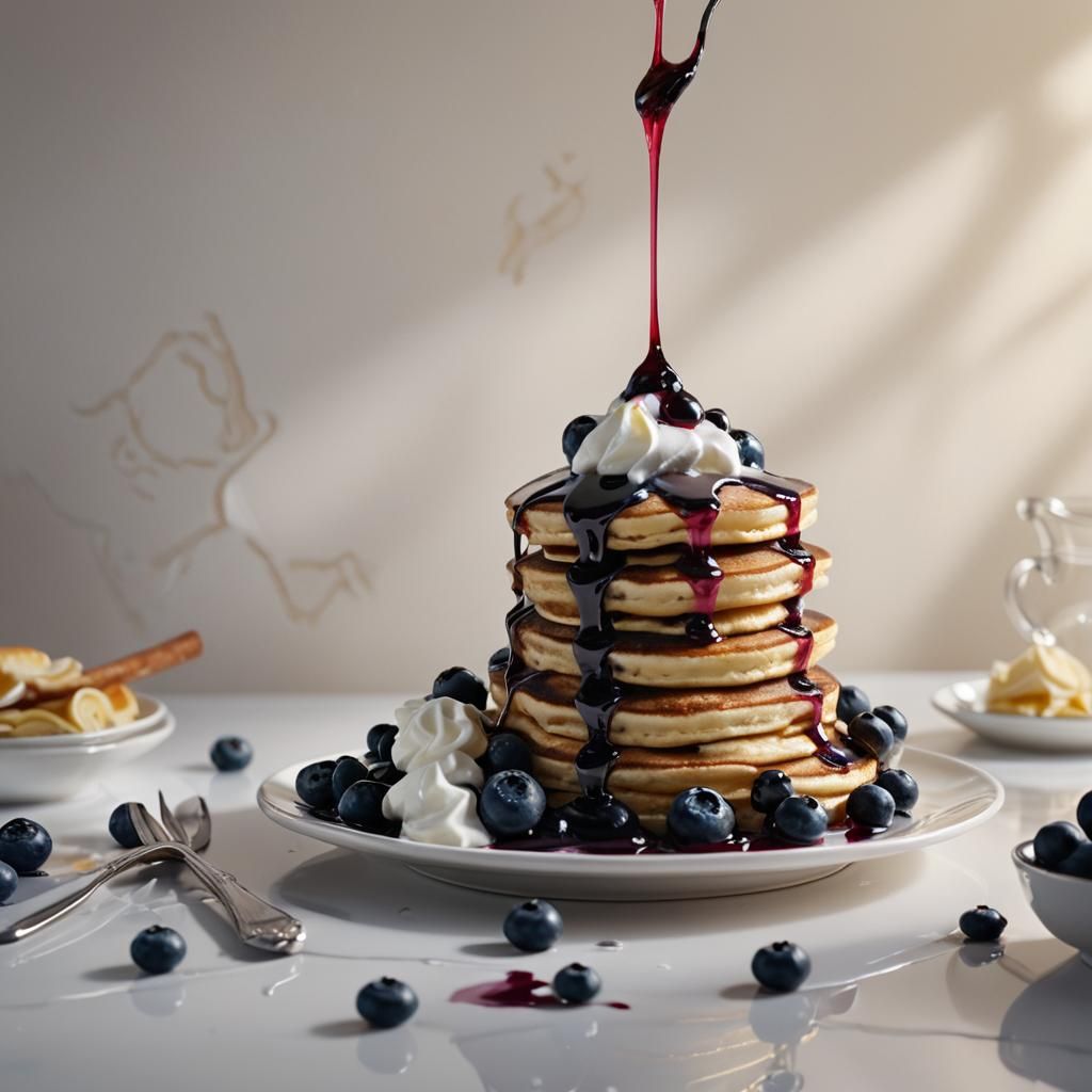 A close-up photograph shows a stack of blueberry pancakes. Melted butter and blueberry syrup cover the pancakes, topped with whipped cream. The image features vivid colors and extremely detailed textures.