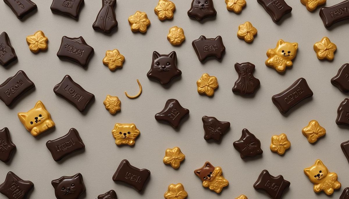 This image shows two blocks of rich dark chocolate shaped like a kitten and a puppy. The composition and color palette evoke Van Gogh's post-impressionist style.
