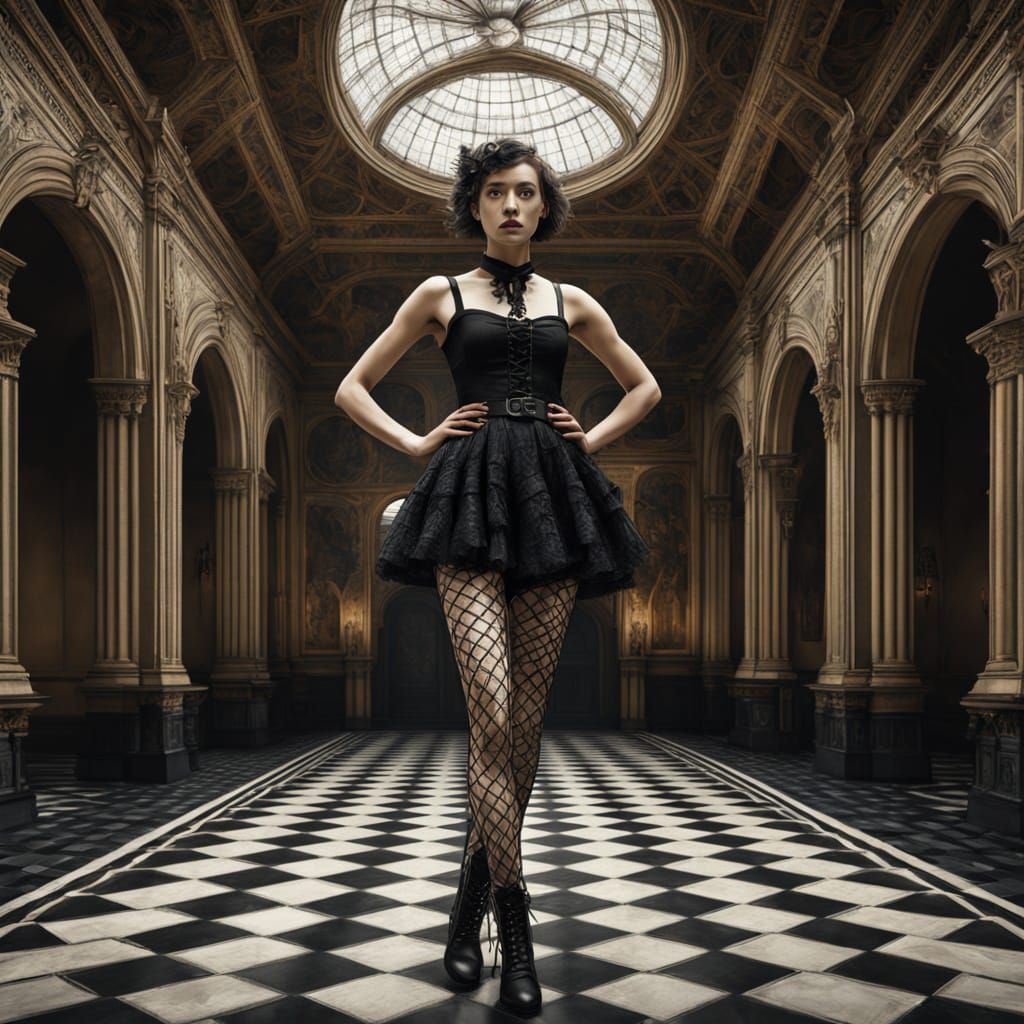 A striking image of an elegant lady in Gothic attire, featuring corsage, hot pants, and lace-up boots. Presented in a vibrant pop art style with Bauhaus geometric framing and dynamic lighting.