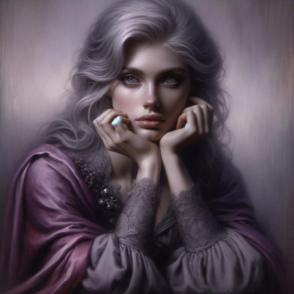 This image shows a thoughtful Norse goddess with silver hair and dark eyes, wearing a violet cape. Created in the style of late 19th-century Symbolism, emphasizing rich textures and delicate realism.