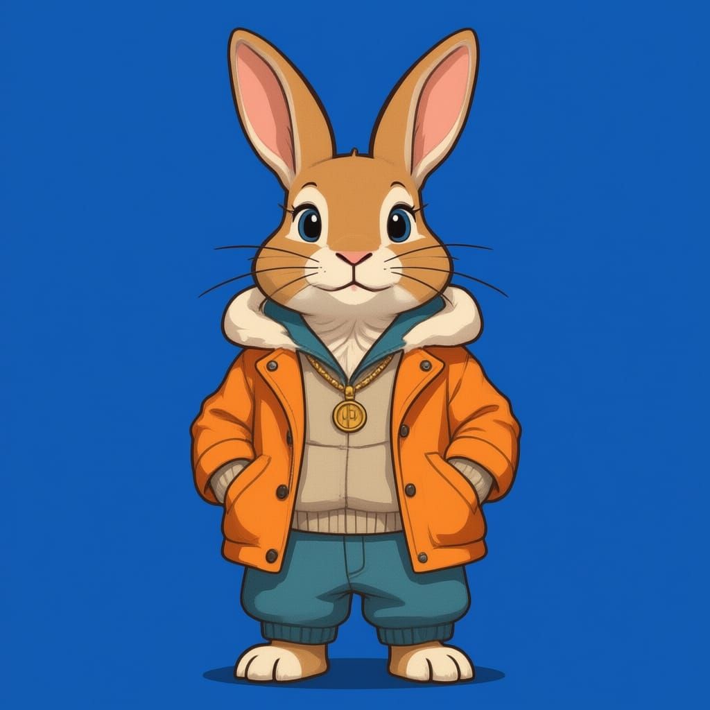 This image shows a realistic rabbit standing upright and wearing modern clothing. The animal has a human-like posture and expression, rendered with detailed fur texture and photorealistic lighting in a vibrant NFT art style.