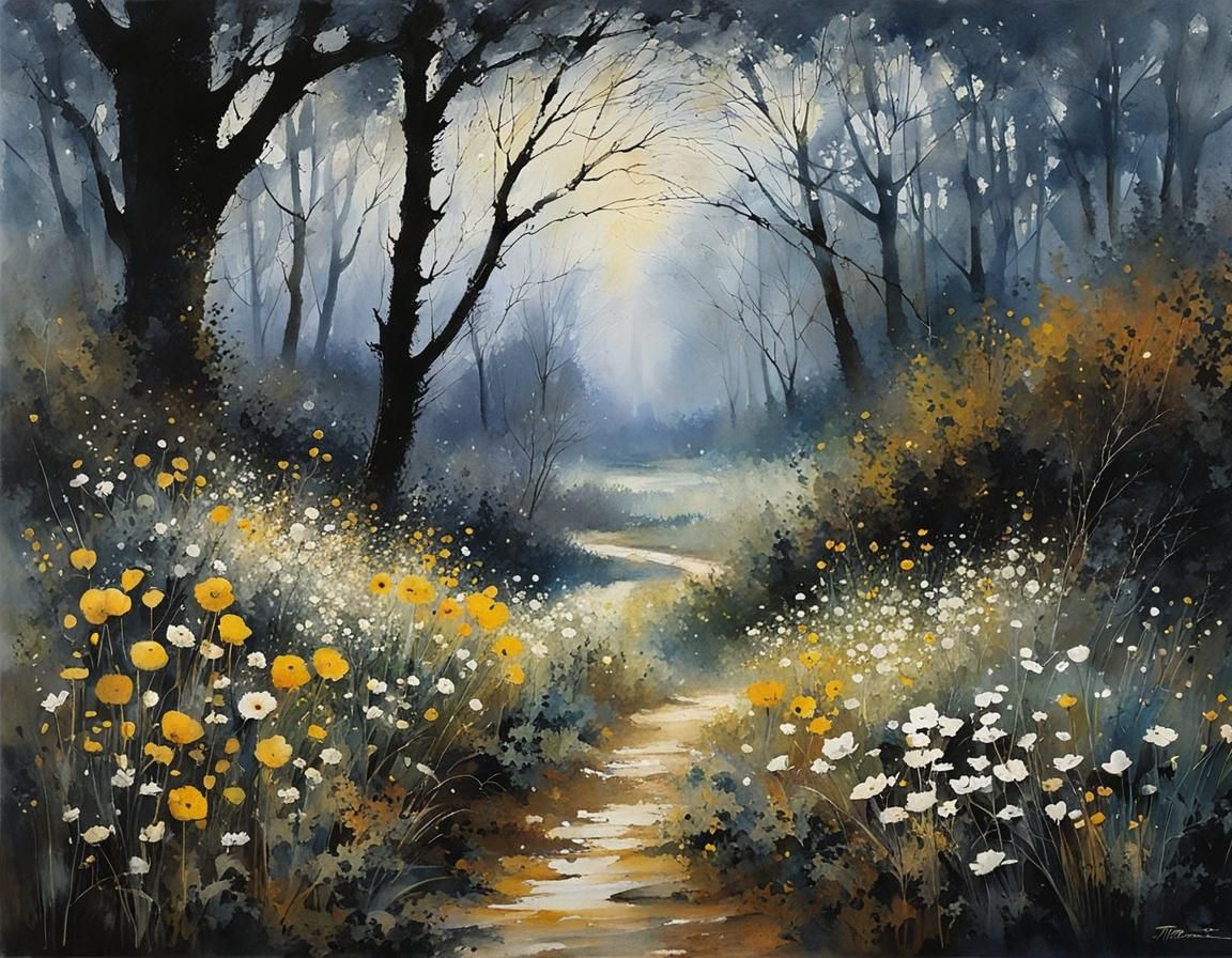 This image depicts a beautiful floral scene with intricate details, showcasing the whimsical connection between spring blooms and winter's tranquil dreams, rendered in a delicate watercolor style