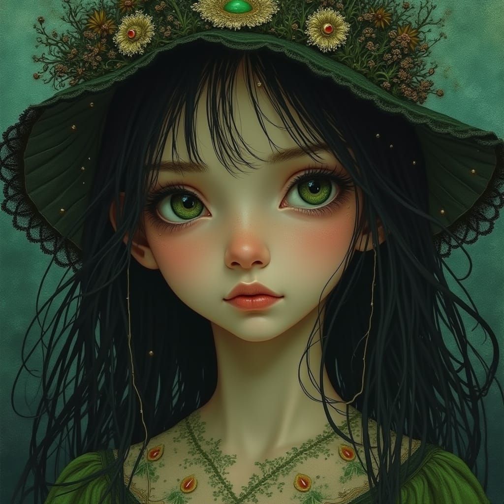 This image shows a close-up of a girl's eye with long black eyelashes and striking green and brown coloring. The image has an ethereal atmosphere in an art nouveau style.