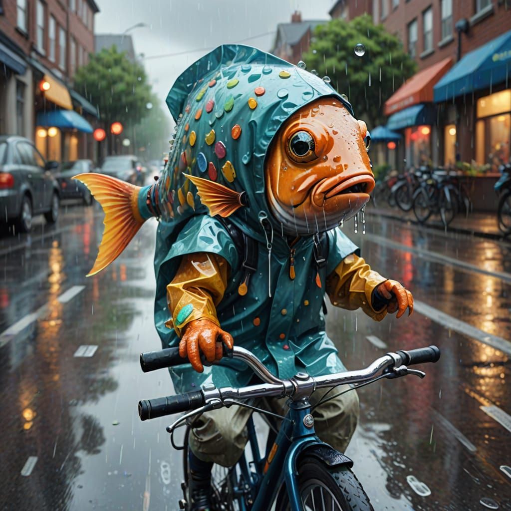 A vibrant digital painting featuring a fish riding a bicycle while wearing a raincoat. The playful, dreamlike image is rendered in high detail with soft lighting and an overcast sky.
