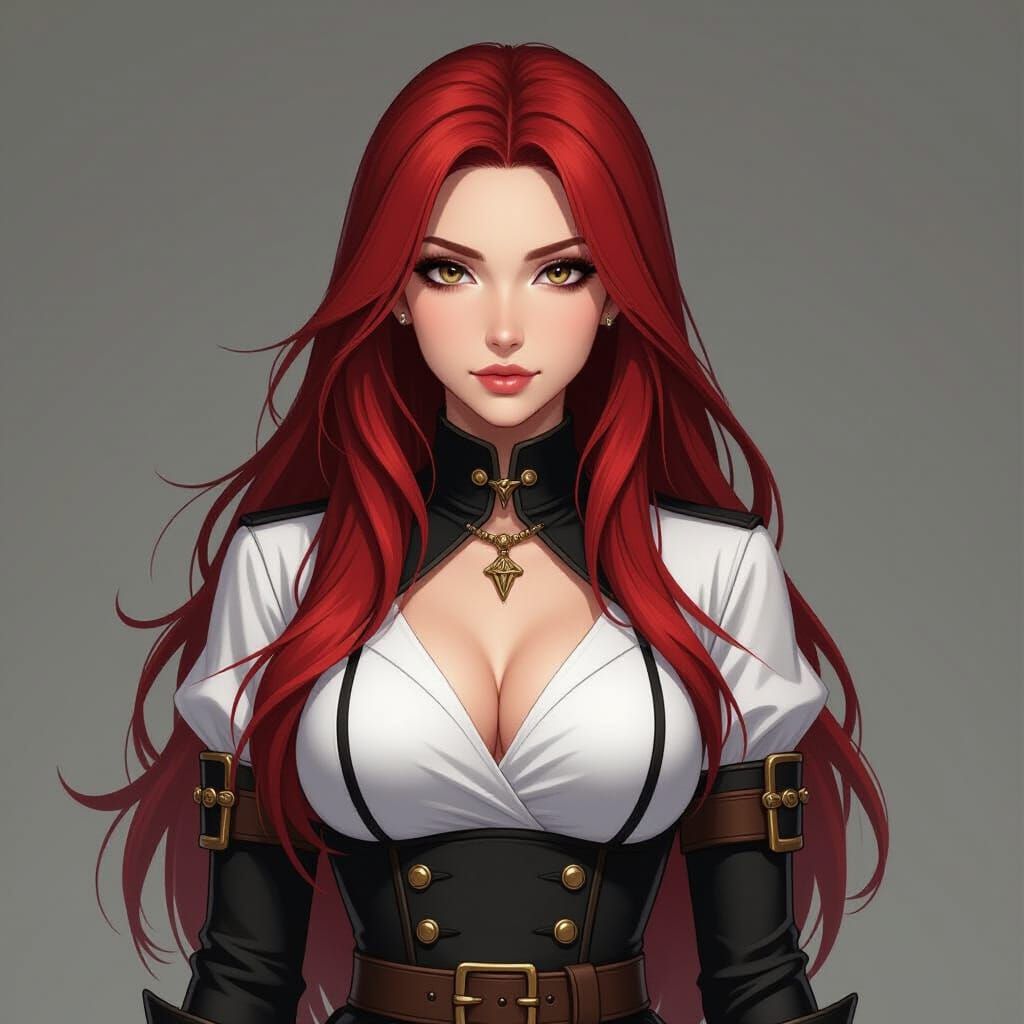 This image features a 39-year-old woman with long red hair and dark brown eyes, dressed in a striking white and black cultist uniform.