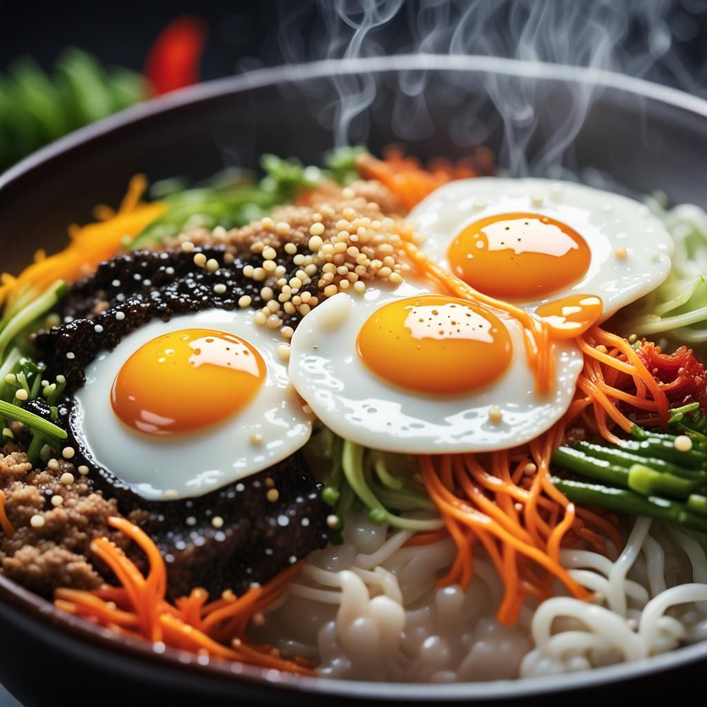 A macro photograph of a steaming bowl of bibimbap with golden lighting. The image features vibrant colors, high contrast, and a shallow depth of field, highlighting the details of the dish.