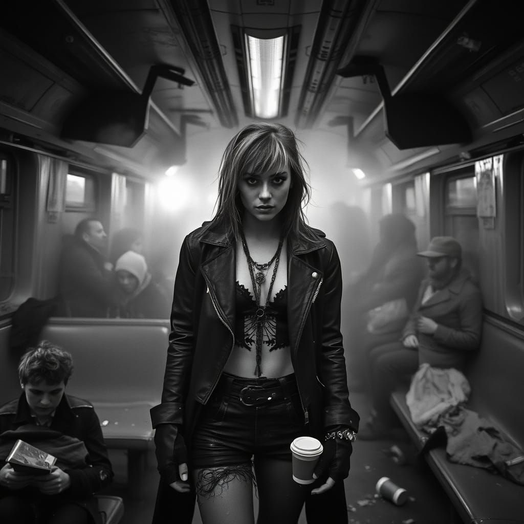 A striking picture of a punk fashion model in a subway station. The scene is shot in high-contrast black and white, with fog, cigarette smoke, and flickering lights, creating a cinematic, film noir aesthetic.