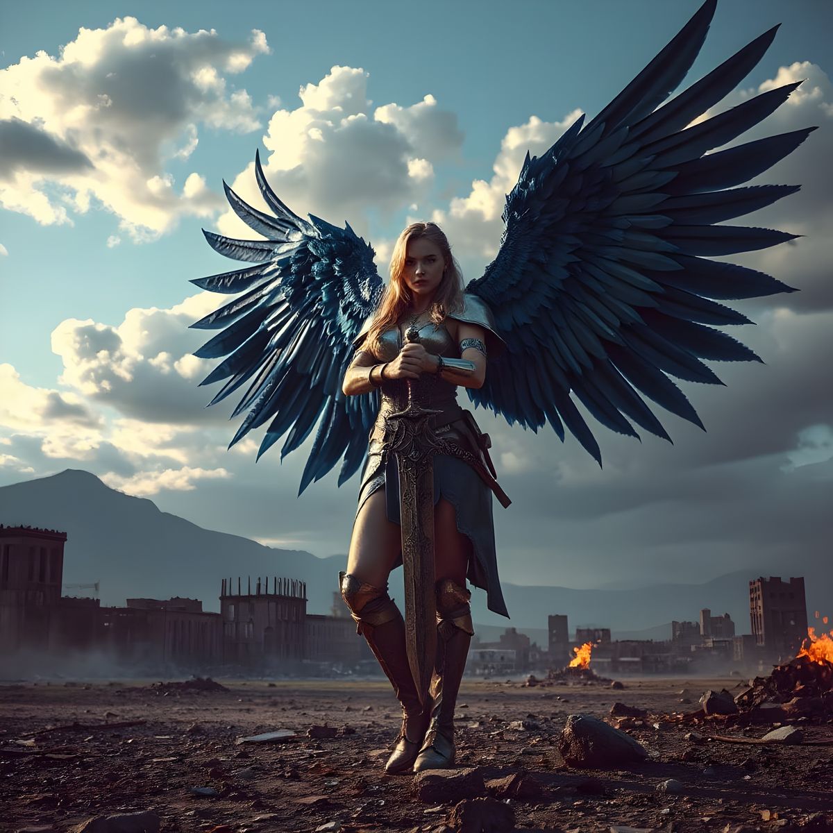 This image shows a winged female warrior in a desolate, post-apocalyptic setting. She holds a sword with large, spread blue wings, rendered as fantasy digital art with rich colors.