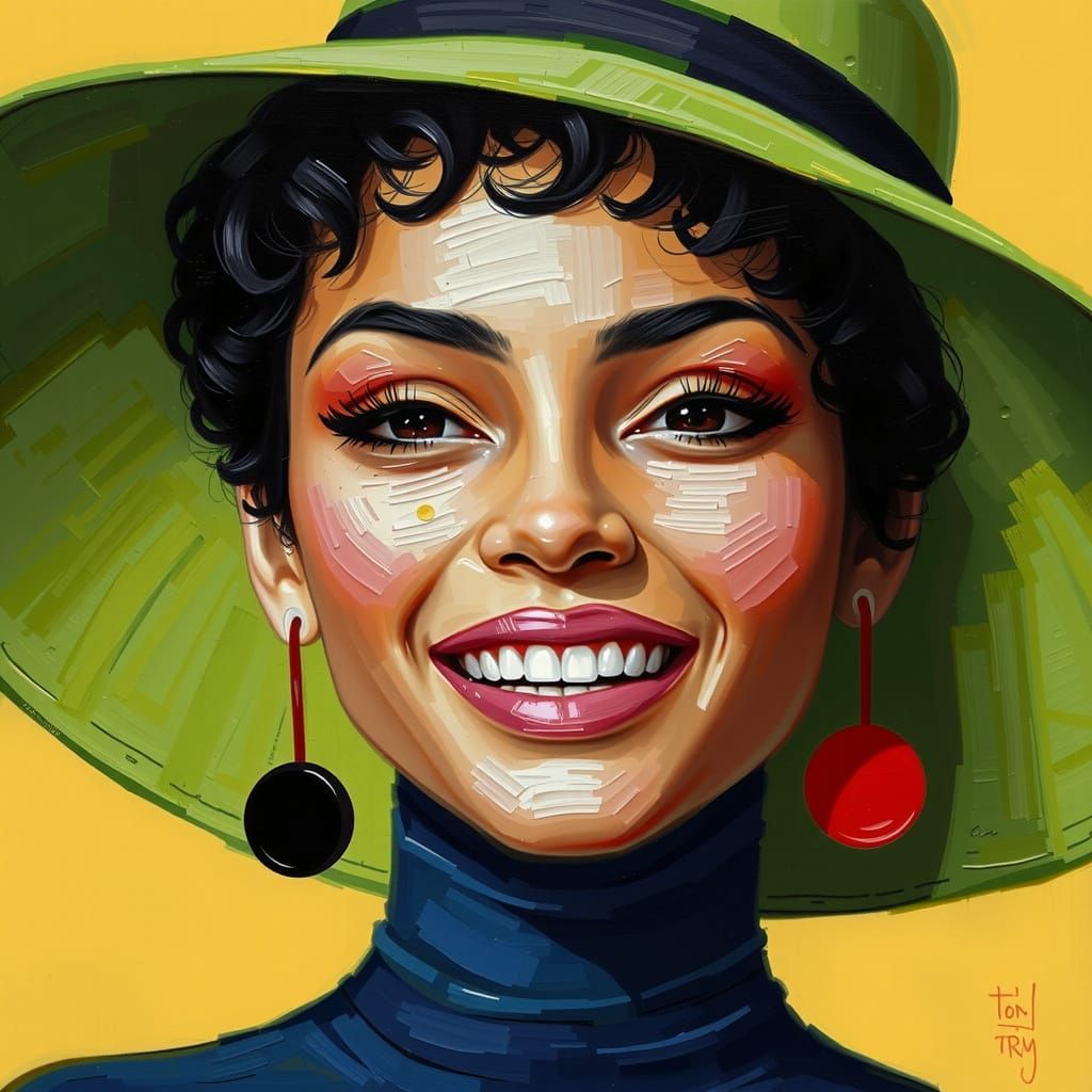 This painting features a smiling woman with short, curly dark hair, wearing a chartreuse hat and blue turtleneck. Distinctive brushstrokes highlight her expressive eyes and pink cheeks.
