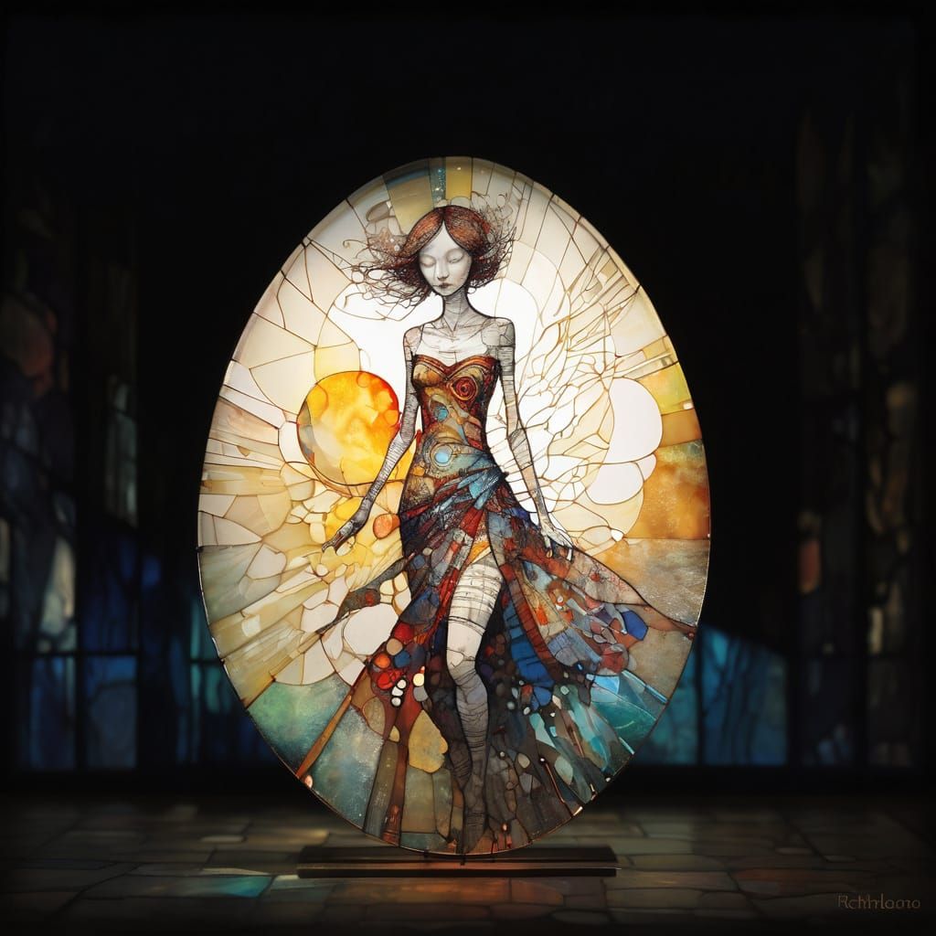 This image showcases a stunning stained glass artwork in the Art Brut style, featuring intricate details and vibrant colors, with a focus on accurate anatomy and dramatic natural lighting.