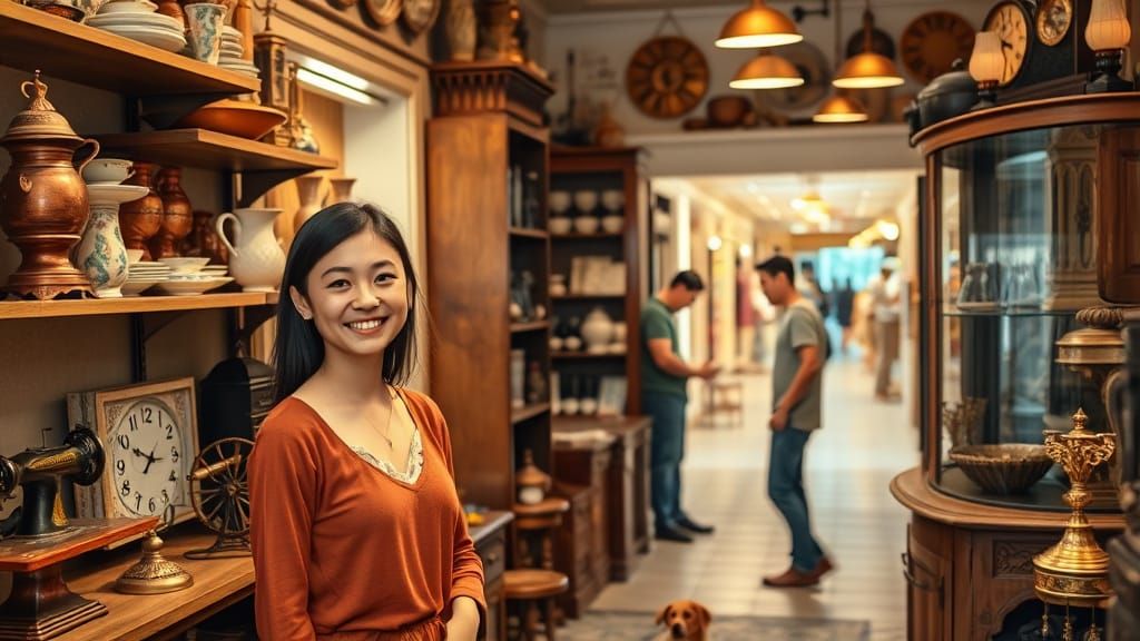 This inviting vintage shop interior showcases a young woman entering, surrounded by antique treasures, warm wood tones, and soft natural light, creating a sense of nostalgia and welcome