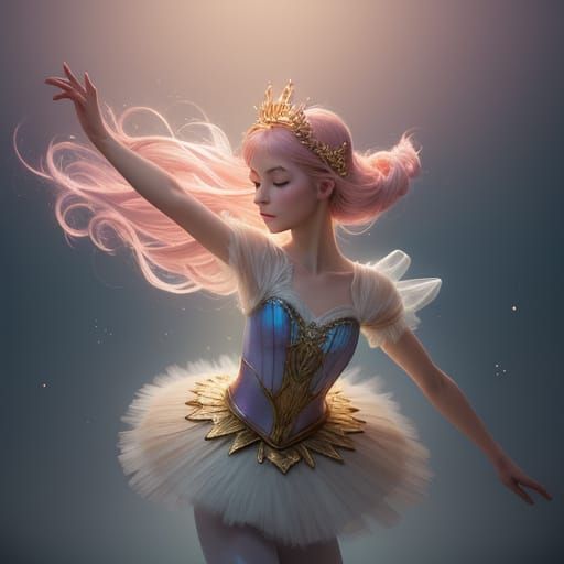 Concept art showing a young ballerina twirling, with a luminescent thought bubble above her head. The scene features a soft, ethereal glow and golden hour lighting with vibrant pinks and purples, creating a dreamlike fantasy illustration.