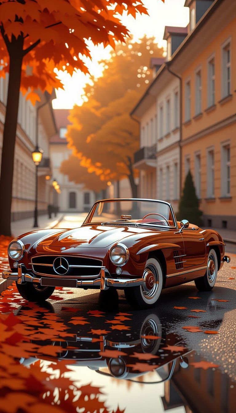 This image shows a classic Mercedes-Benz 300SL convertible parked on a quiet street. The car is painted in glossy brown, and the scene is rendered with dynamic lighting and intricate details, in a hyperrealistic digital art style.