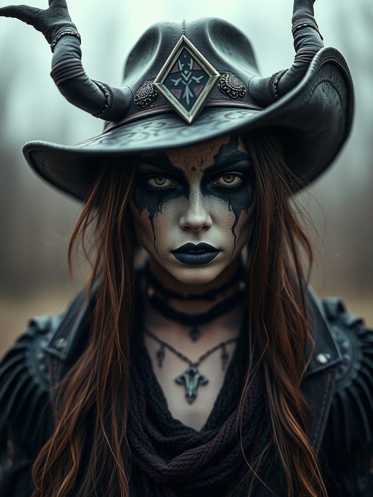 This image shows a haunting portrait of a woman in dark fantasy attire, blending cyberpunk and realism in a striking, hyperdetailed concept art style. Influenced by dark fantasy and cinematic techniques, this piece captures a sense of drama and atmosphere, reminiscent of a 35mm film still.