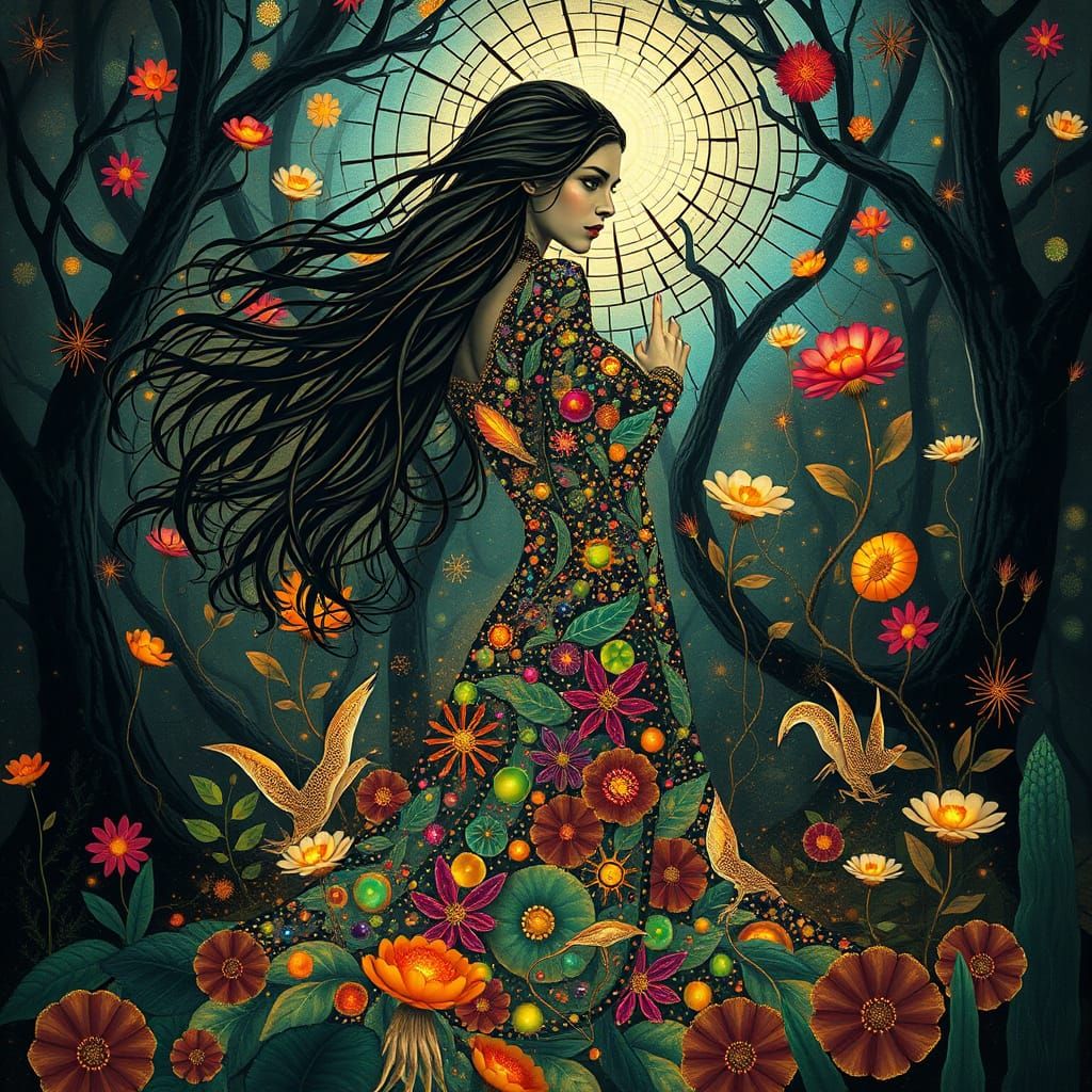 This image depicts a woman surrounded by mythical creatures and a vibrant fantasy plant kingdom, set against a backdrop of a surreal labyrinth of cracked mirrors, evoking a whimsical and dreamlike quality.
