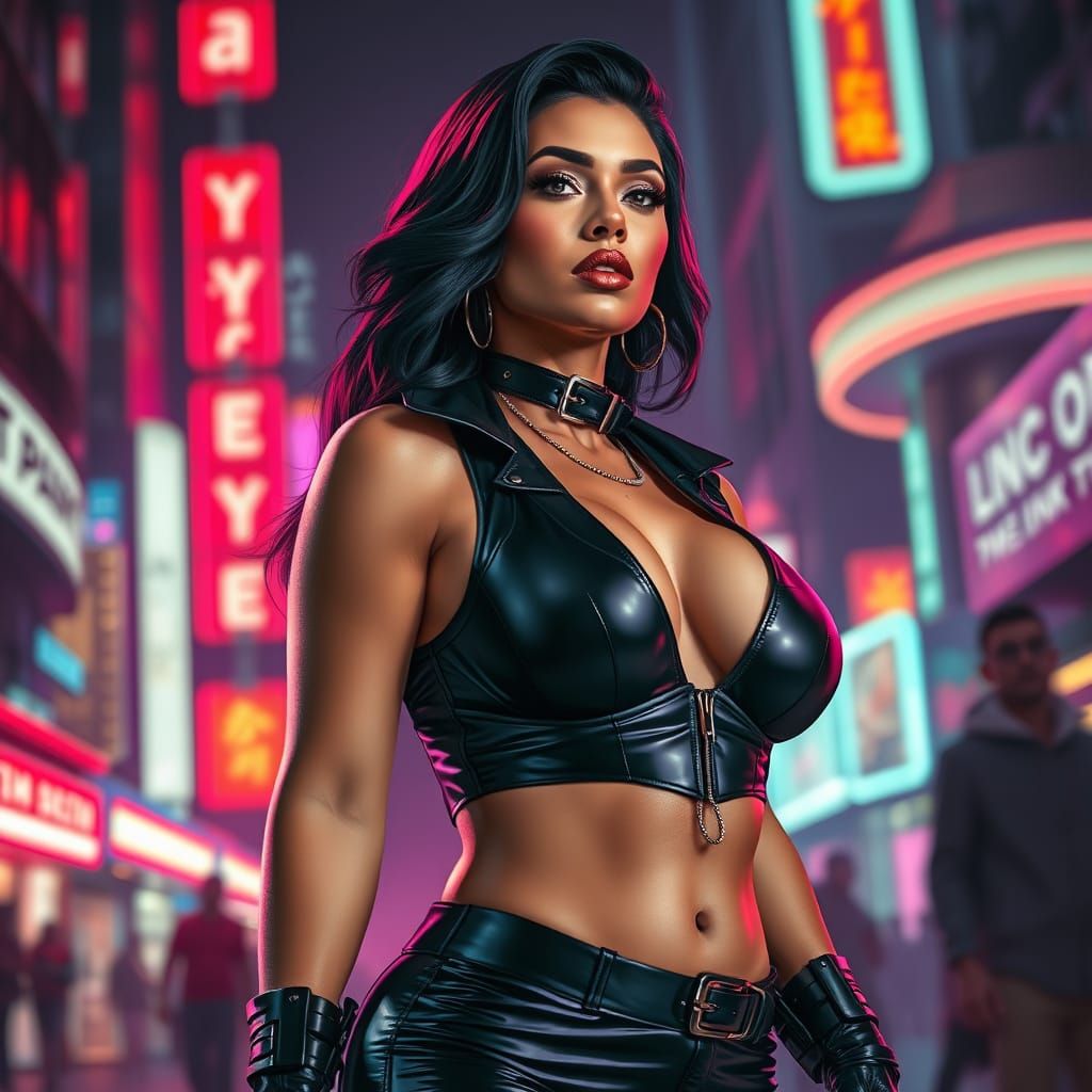 This image shows a curvy woman in futuristic clothing, standing in a neon city. The artwork blends cyberpunk and noir styles with bright colors and metallic details.