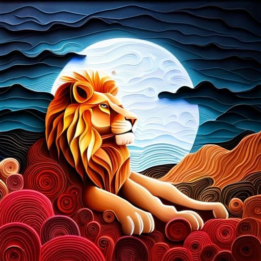 A vibrant paper quilling artwork of a majestic lion set against a surreal backdrop. This image showcases high-contrast shading and a dreamlike fairy tale aesthetic.