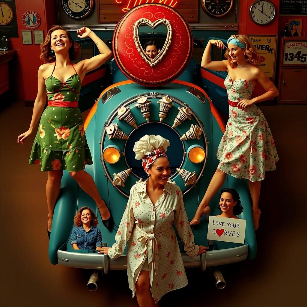 This vibrant image captures diverse women in their 30s and 40s celebrating self-love and body positivity in glamorous 1940s and 50s pin-up fashion within a retro diner setting.