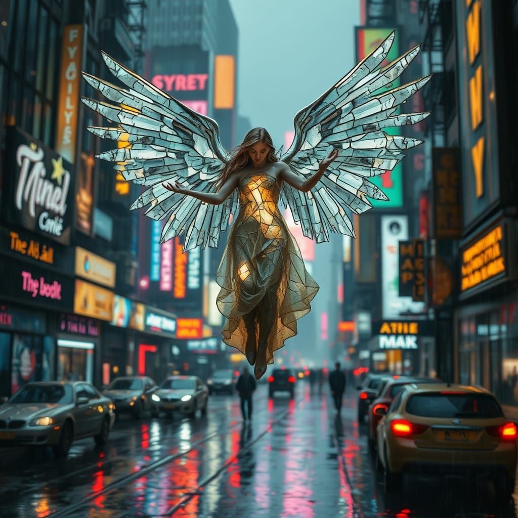 This image features an ethereal angel with shattered stained glass wings arriving in a rainy, neon-lit cyberpunk metropolis. The scene contrasts divine fragmentation with a gritty, futuristic urban landscape.