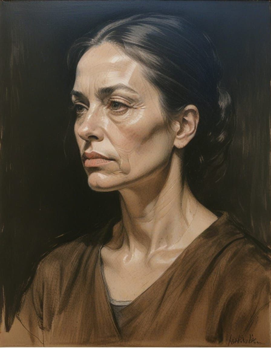 A haunting charcoal and pencil portrait of a girl with a somber expression, set against a moody background with dramatic chiaroscuro and intense emotional depth.