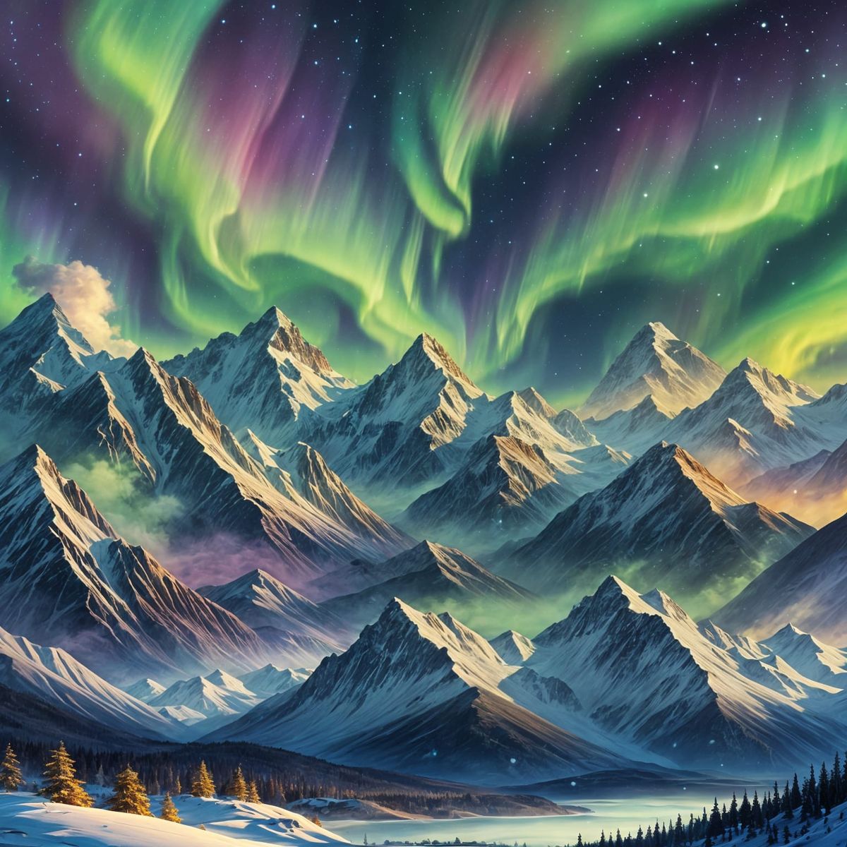 This image shows the aurora borealis illuminating a night sky during a full moon. The scene is rendered as a detailed matte painting with deep colors and intricate details, in a fantastical style.