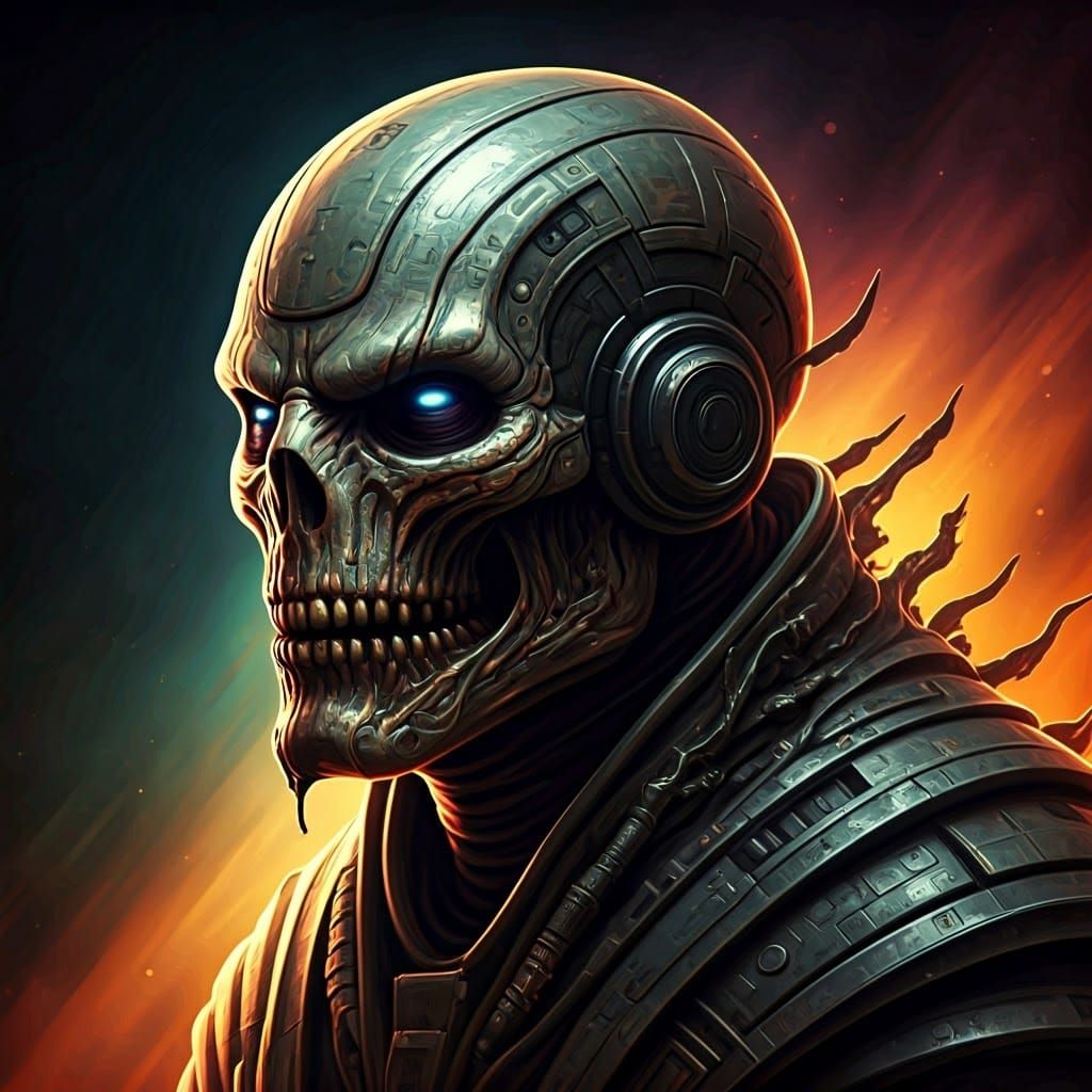 A hyperrealistic splash art portrait of the Grim Reaper, showcasing detailed textures and vibrant colors. The image captures an eerie, mysterious essence with blended organic and synthetic elements, reminiscent of sci-fi film.