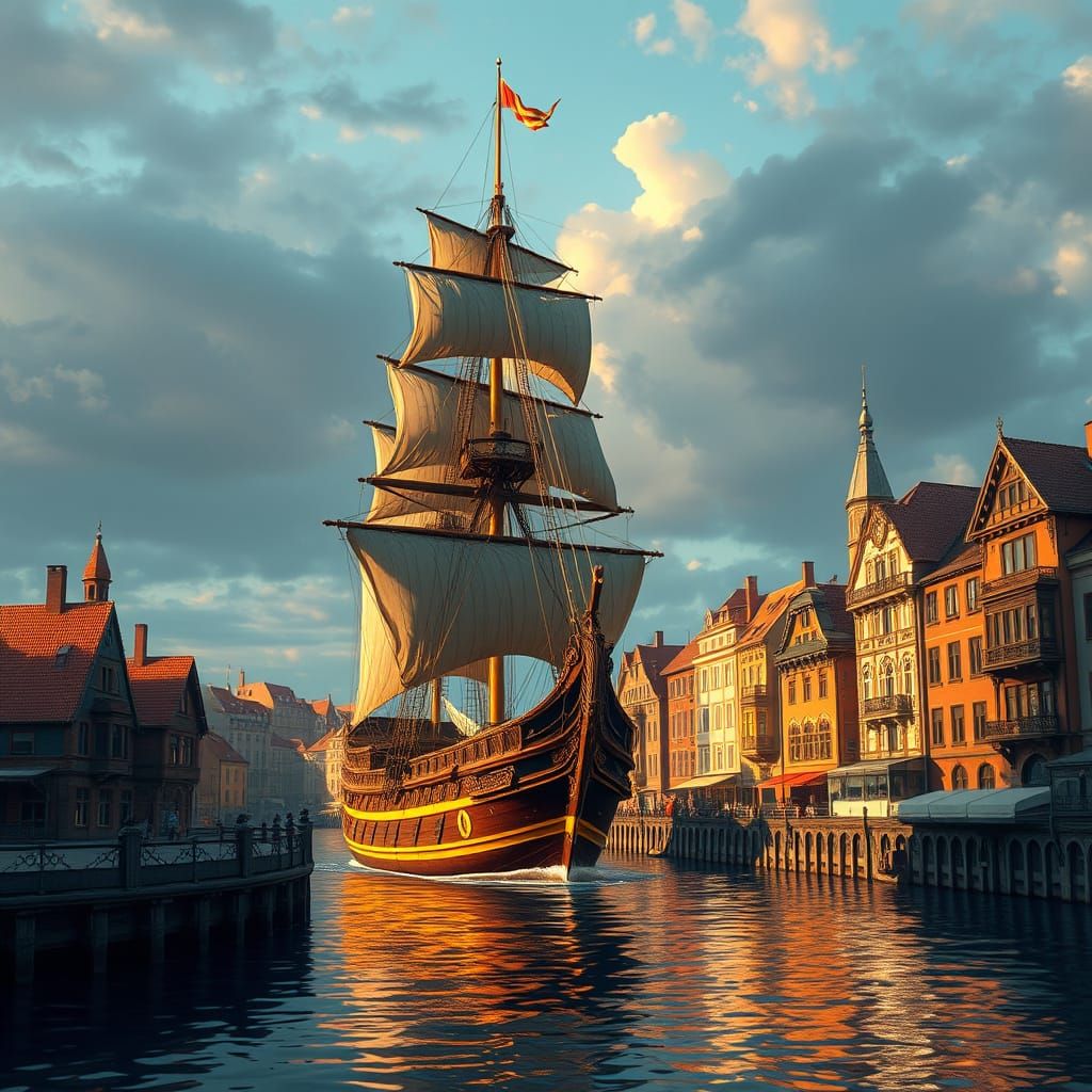 A majestic ship with billowing sails docked by colorful, historic buildings along a serene waterfront, creating a picturesque scene reminiscent of a bygone maritime era.