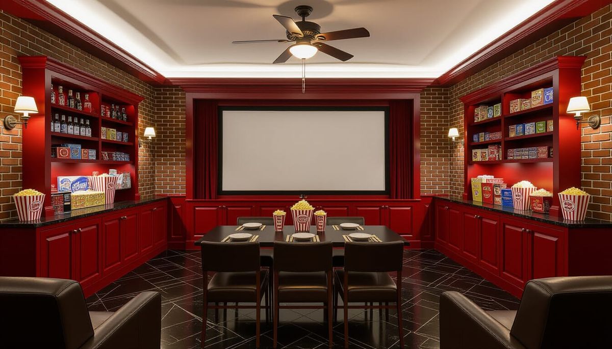 This image showcases a cozy Victorian-style home theater, featuring plush seating, a large screen, and a snack bar, all rendered in a photorealistic style with warm lighting.