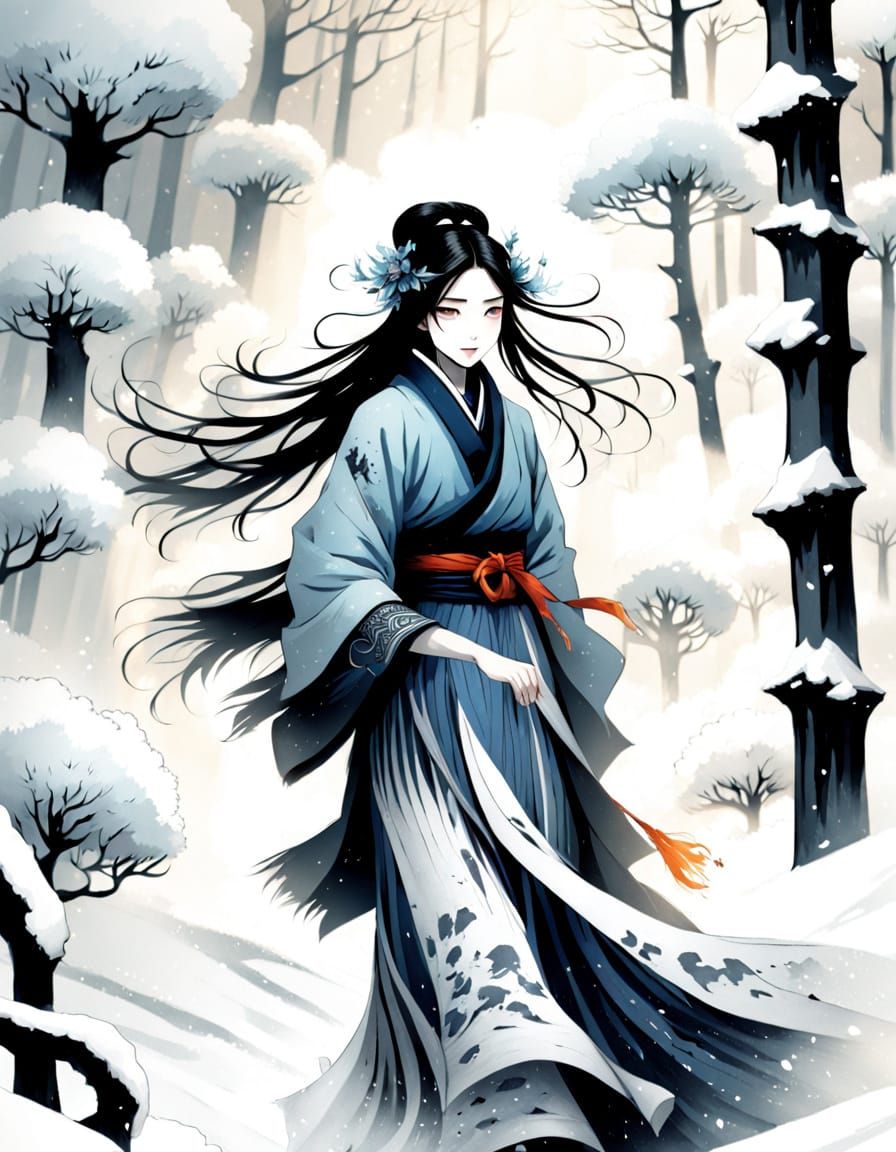This image depicts a spectral beauty, a Yuki-onna, consumed by flames in a dynamic anime splash art style. Vivid blues and fiery oranges highlight the contrast between frosty grace and fiery destruction.
