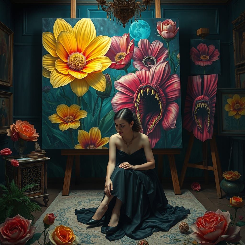 This image shows an artist surrounded by cosmic horror art in a dimly lit chamber. A vibrant canvas with unsettling flowers, featuring teeth and eyes, sweeps in, set against a haunting garden, in a dark surrealist style.