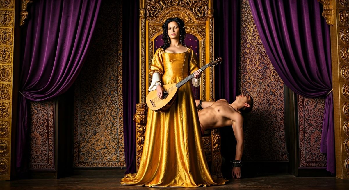 A striking picture of a confident woman in a golden dress holding a lute, standing over a muscular man restrained on a throne. Ornate tapestries, dramatic lighting, and vivid colors create atmospheric tension in a sci-fi art style.