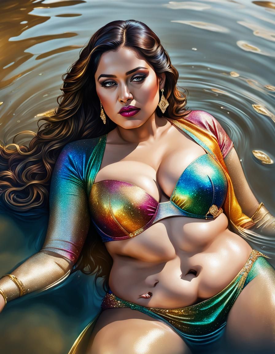 A hyperrealistic image shows a curvy woman with a 40 D chest wearing a deep-cut bandeau blouse and a rainbow golden leather glitter saree. She is laying down in water, creating a mysterious atmosphere.