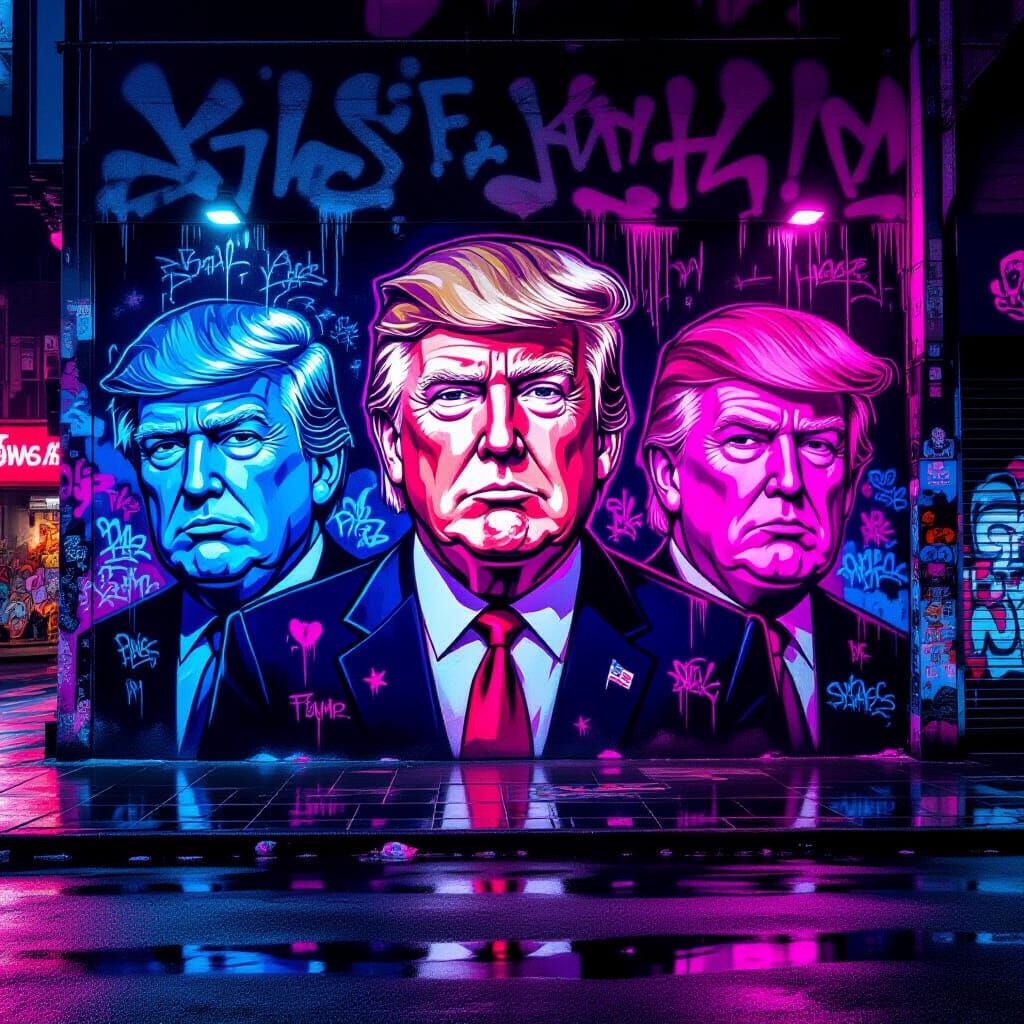 This image shows a dystopian cyberpunk street art mural featuring neon caricatures of Donald Trump with mocking expressions. The art style is dark and satirical, emphasizing stark light and shadow contrasts.