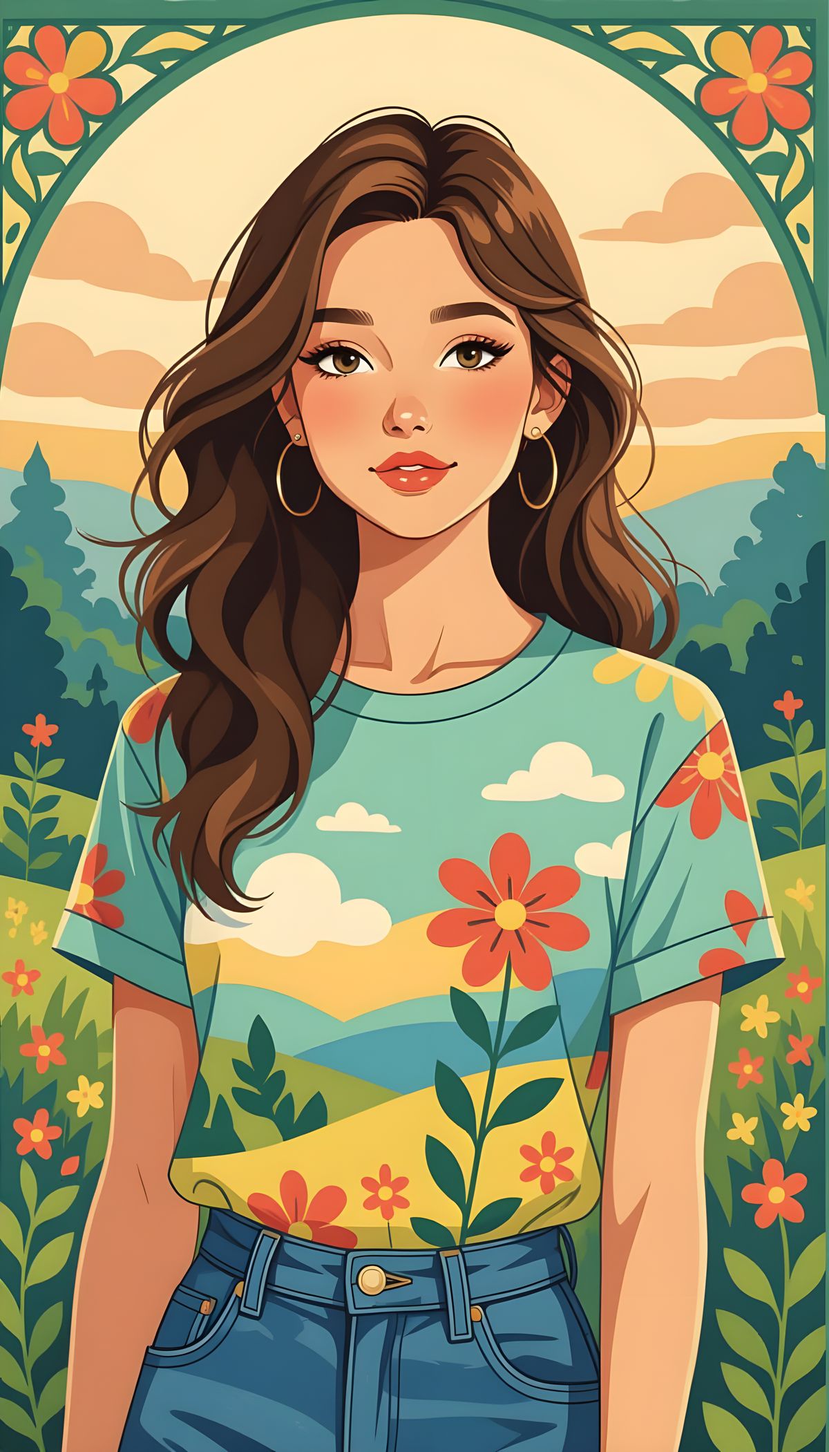 This image depicts a serene watercolor painting of a girl in a t-shirt, set against a peaceful evening backdrop. The artwork emphasizes tranquility and high-resolution detail.